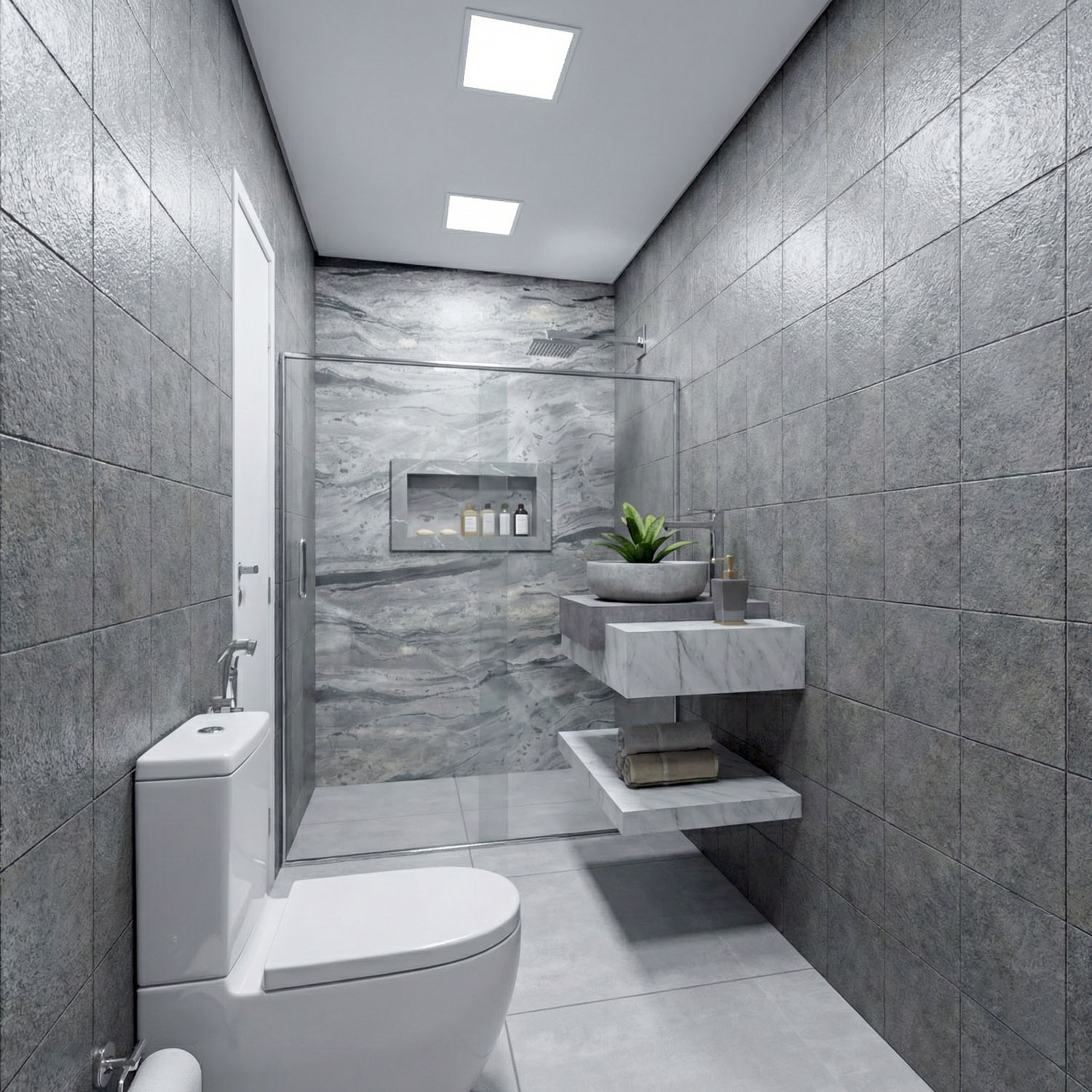 A iluminação estratégica e os revestimentos em tons sóbrios contribuem para uma atmosfera contemporânea e acolhedora. Cada ambiente foi pensado para aliar praticidade e acabamento preciso, valorizando soluções inteligentes que tornam o cotidiano mais funcional sem abrir mão da estética.