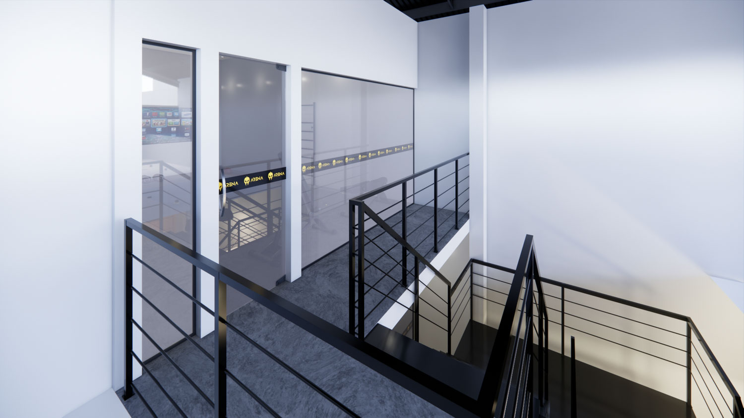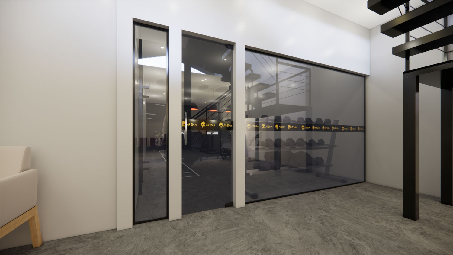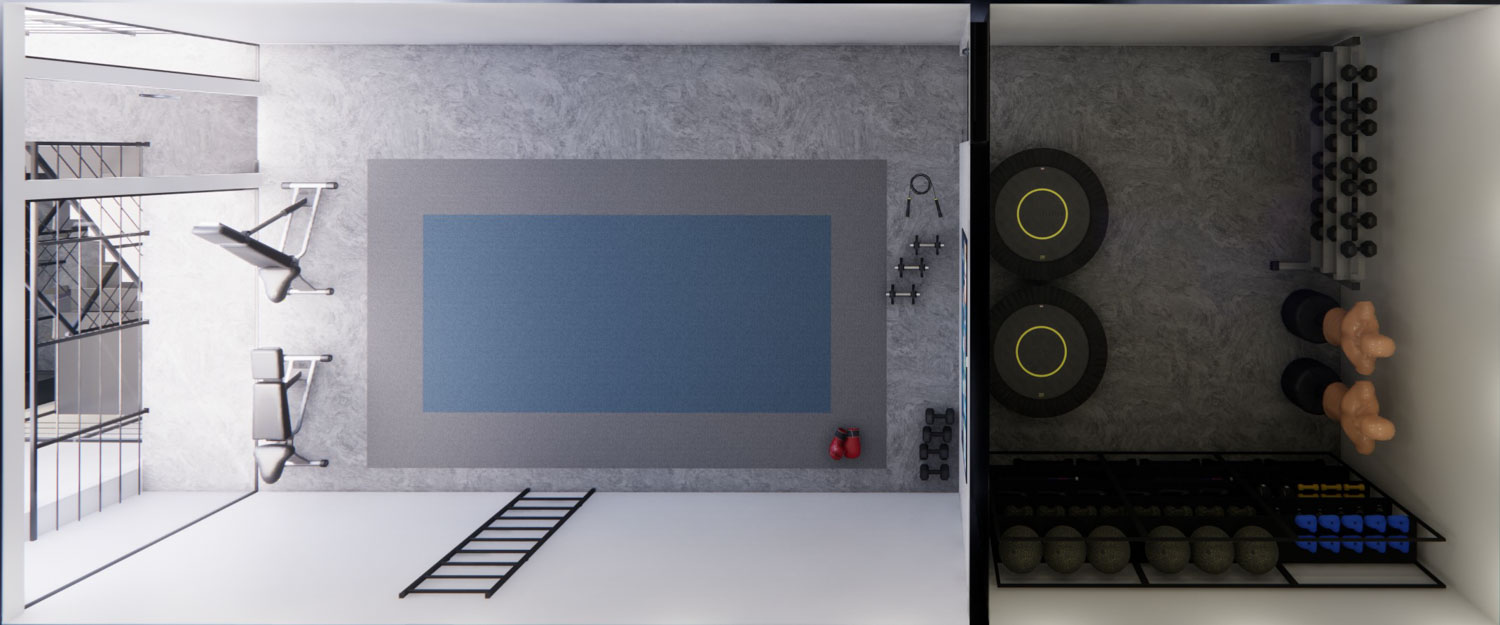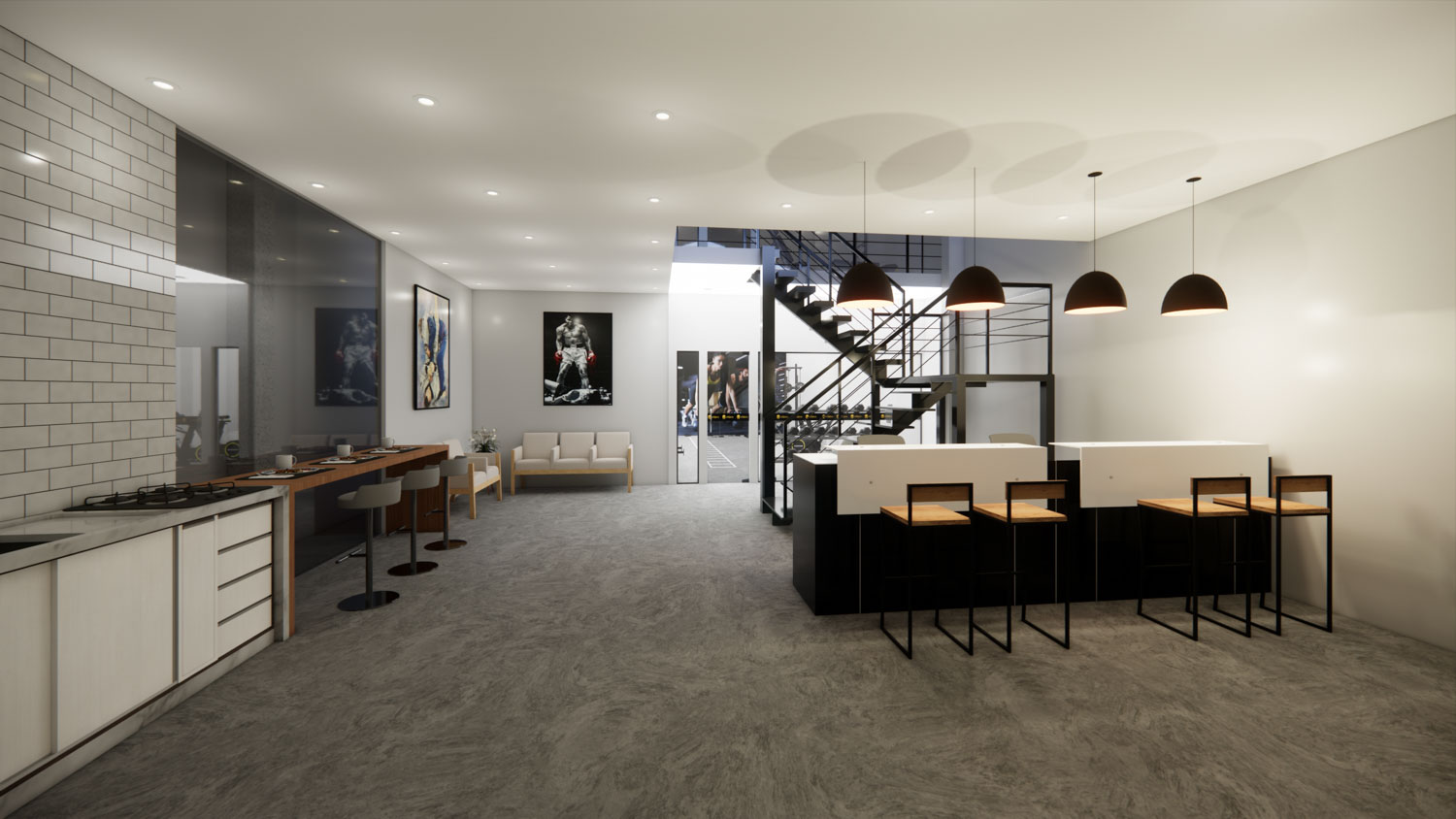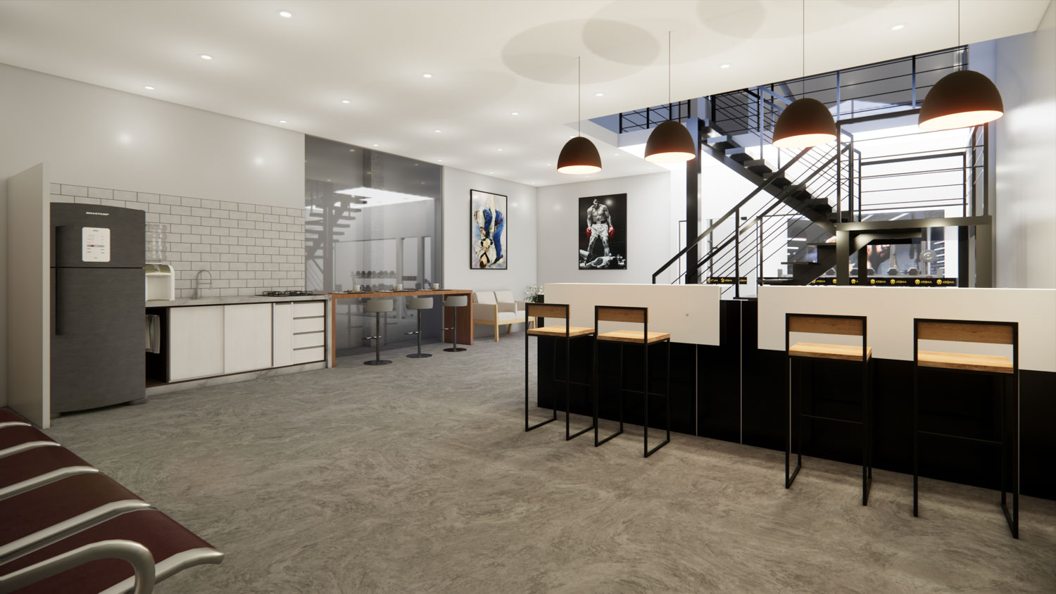 O projeto Dall Arena foi concebido para traduzir força, dinamismo e personalidade em um espaço contemporâneo de uso esportivo. A arquitetura valoriza o pé-direito duplo e a escada metálica como elemento central, criando impacto visual e integração entre os níveis. A composição é marcada por linhas industriais, materiais robustos e uma paleta sóbria que reforça o caráter técnico do ambiente.