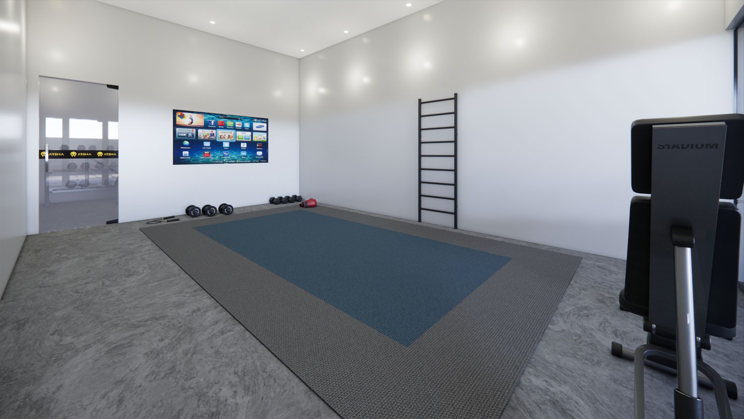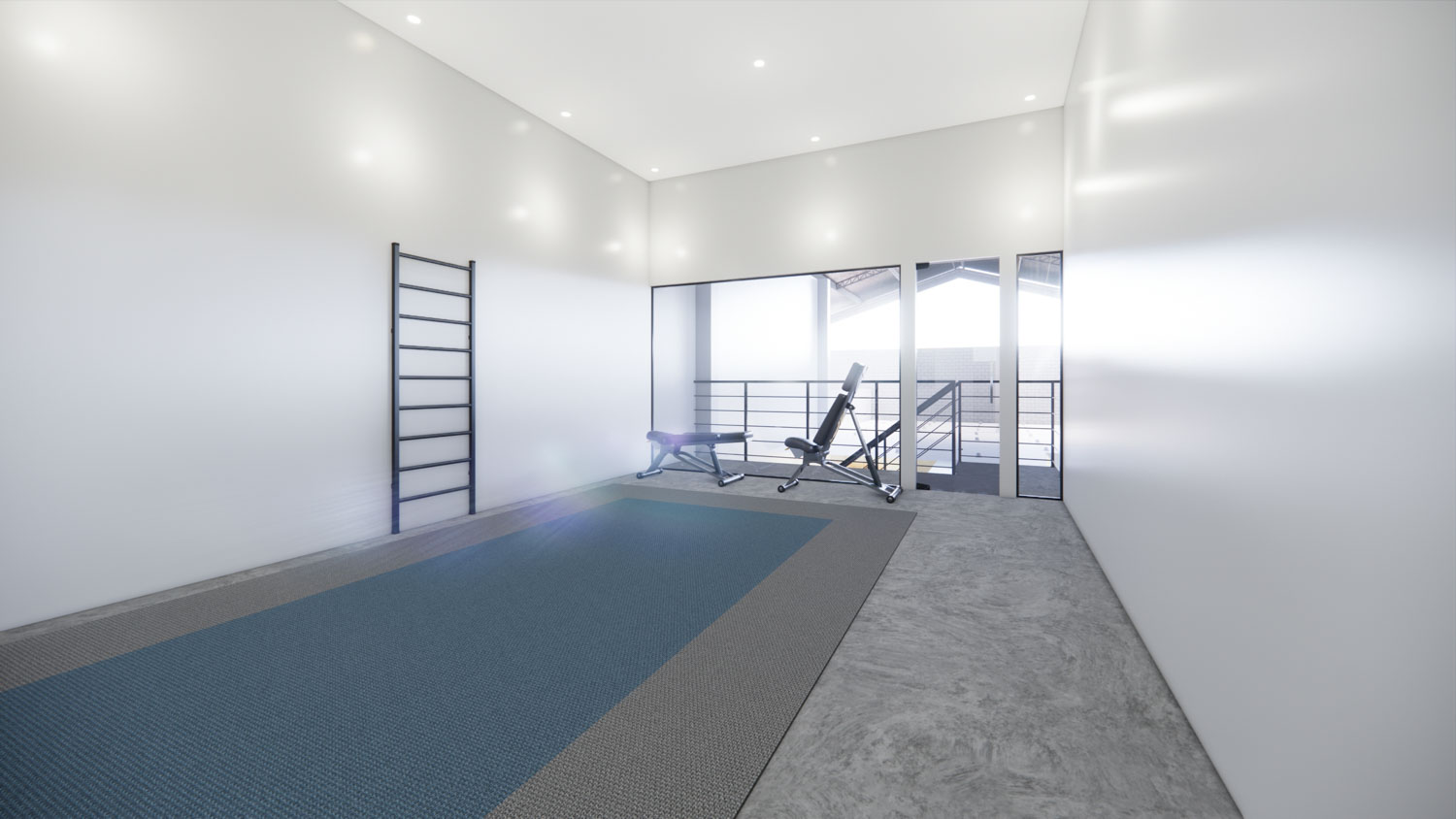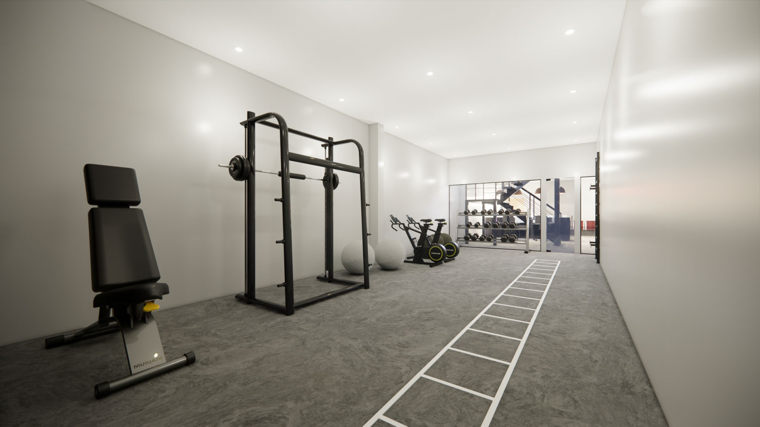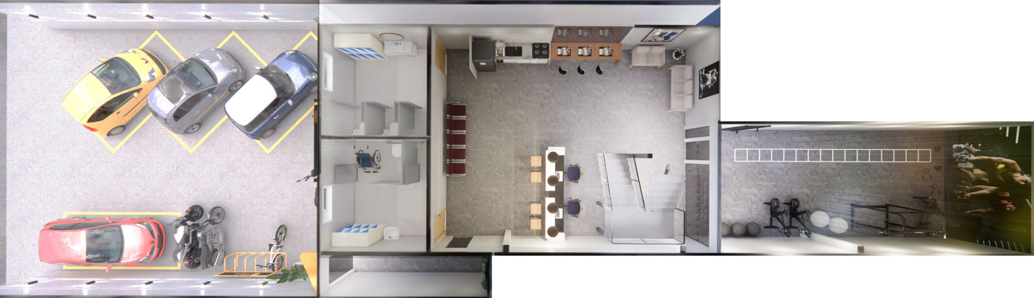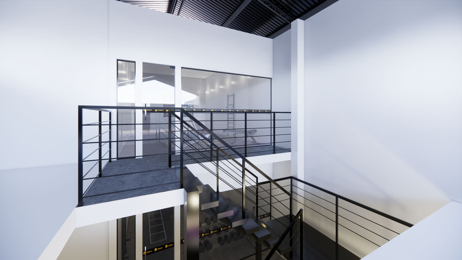 O projeto Dall Arena foi concebido para traduzir força, dinamismo e personalidade em um espaço contemporâneo de uso esportivo. A arquitetura valoriza o pé-direito duplo e a escada metálica como elemento central, criando impacto visual e integração entre os níveis. A composição é marcada por linhas industriais, materiais robustos e uma paleta sóbria que reforça o caráter técnico do ambiente.