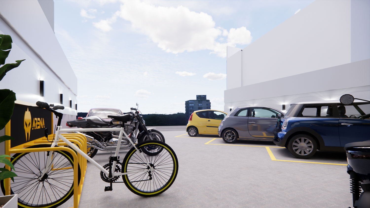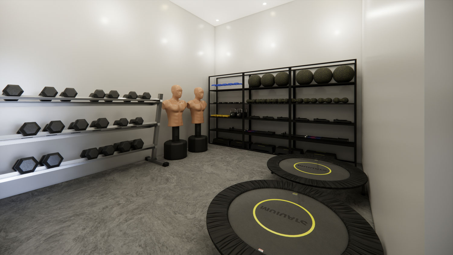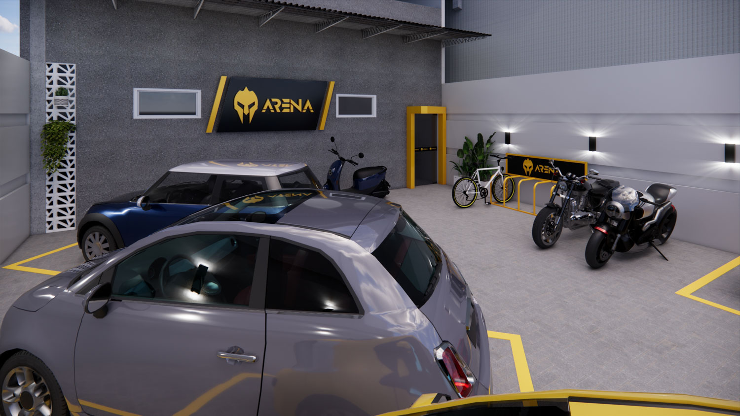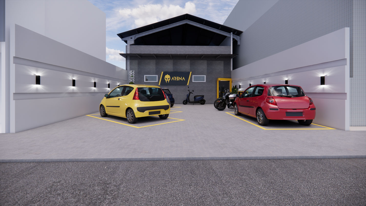 O projeto Dall Arena foi concebido para traduzir força, dinamismo e personalidade em um espaço contemporâneo de uso esportivo. A arquitetura valoriza o pé-direito duplo e a escada metálica como elemento central, criando impacto visual e integração entre os níveis. A composição é marcada por linhas industriais, materiais robustos e uma paleta sóbria que reforça o caráter técnico do ambiente.